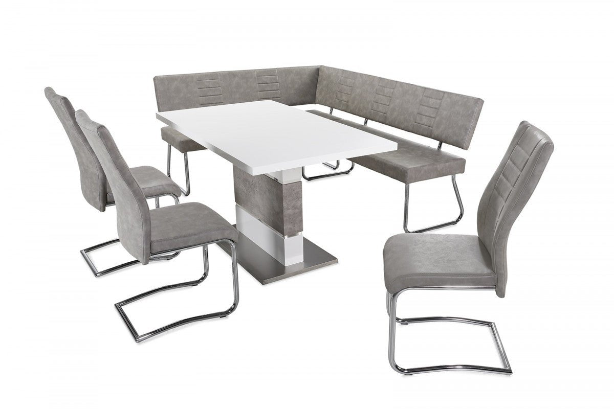 A VIP Kanapé termékkínálatából étkezőasztal és étkezőszék is választható mellé. A Carlos pad párja a Cara étkezőszék, amely szintén szánkótalpas, műbőr vintage szürke borítású. Az asztalok közül a Champ és a Turin modelleket ajánljuk melléjük.