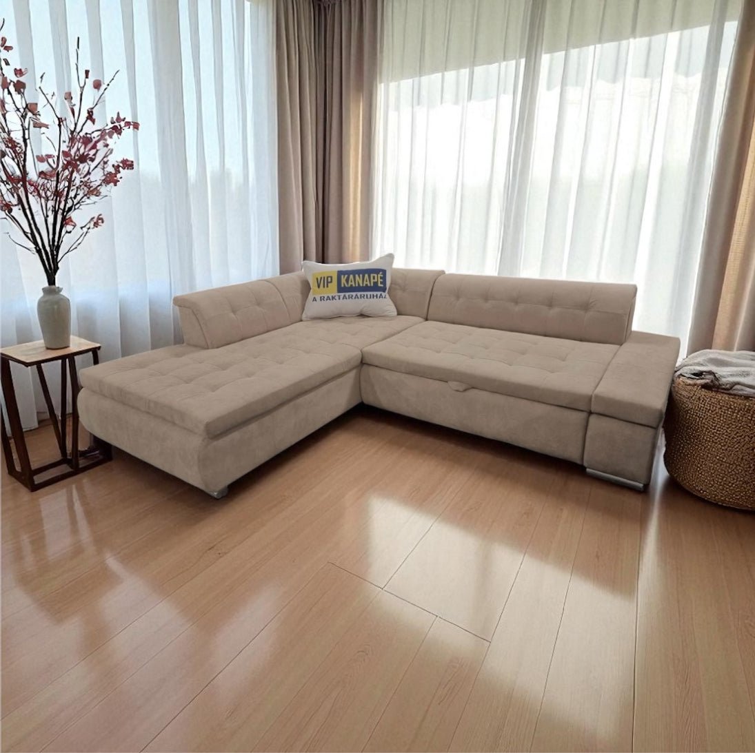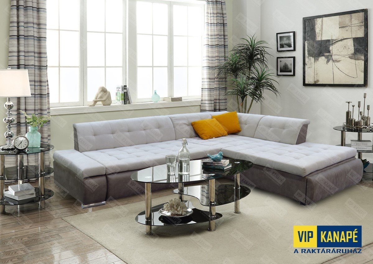 A képen látható sarokkanapé nagyon népszerű, amit a főbb jellemzők indokolnak is: Jaguár – ágyazható, kérhető ágyneműtartó, méreteiben, színben és anyagban módosítható, 160 cm x 220 cm fekvőfelületű. Kell ennél több? A bútor kinézetre is nagyon tetszetős, a modern nappalik ékessége lehet.