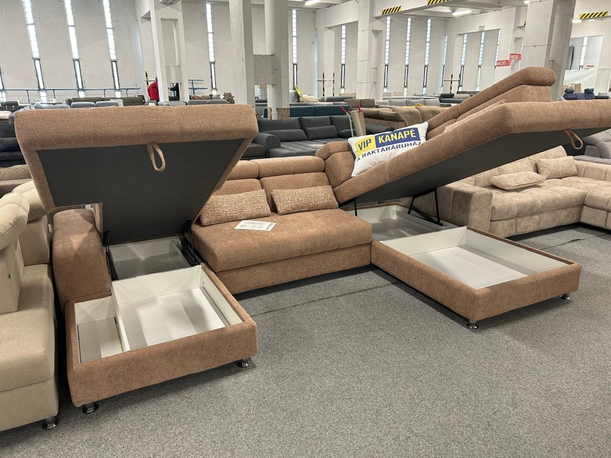 Nagy pozitívuma még az U alakú kanapénak, hogy 2 darab ágyneműtartója is van, amely praktikus, ha több mindent szeretnénk tárolni. Szép, formázott lábakon áll az ágy, padlófűtéses helyiségben is helyet kaphat.