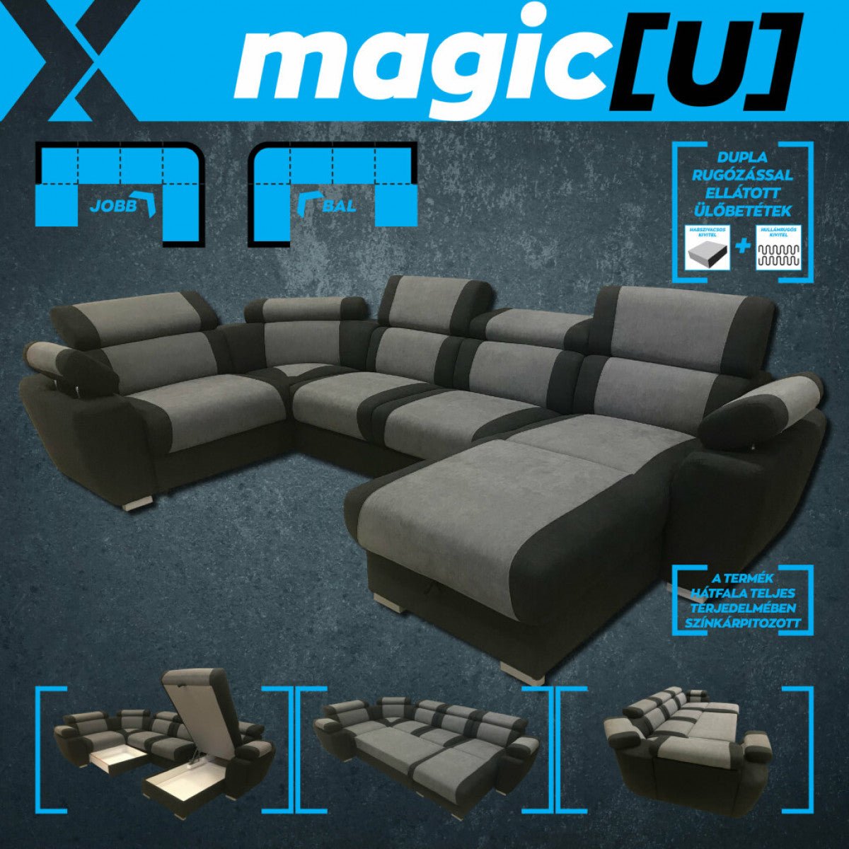 Gigantikus méreteivel a nagycsaládok, társaságkedvelők számára ideális választás. Minőségét a profi gyártási technológia biztosítja. Funkcionális, mutatós sarokkanapé, örök darab, mely újra és újra elkápráztatja majd vendégeit és családtagjait. Ággyá nyitható kivitelben is rendelhető, óriási fekvőterülettel. Szerkezeti tulajdonságaiból adódóan kényelmes ülő és fekhelyet biztosít.