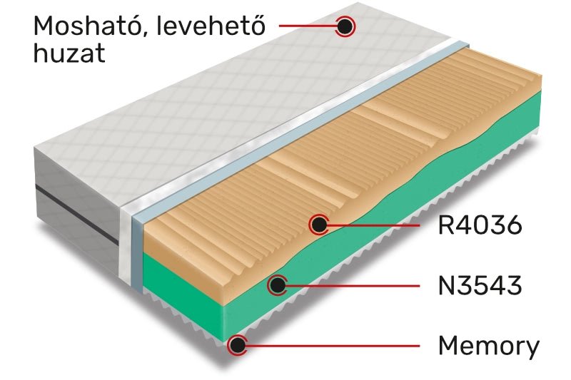 - Keményebb memóriahabos matrac, amely kiváló alátámasztást nyújt a gerinc, a végtagok, a fej és a nyak számára.