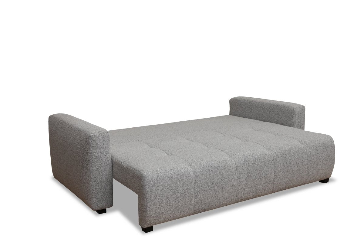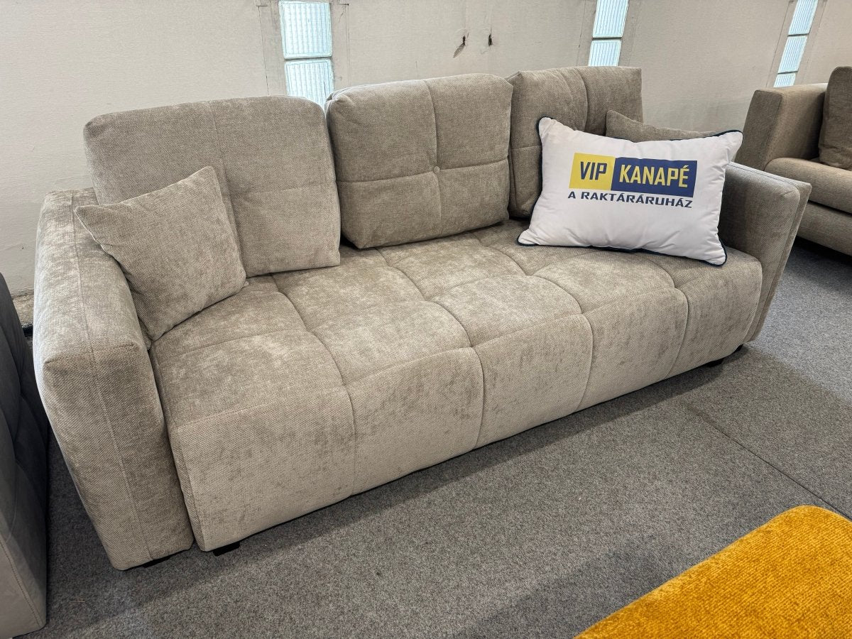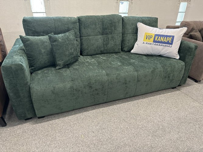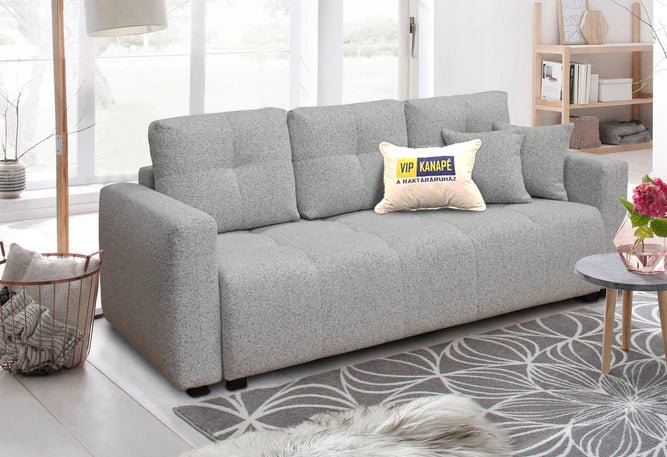 A kanapé ülőrészét előrehúzva láthatóvá válik az ágyneműtartó, a háttámla ledöntésével pedig egy széles pótágyat kapunk. Apró lábakon áll a bútor, az sem gond, ha padlófűtéses szobába kerül.